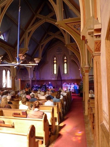 The doors are open to come see one of the finest surviving examples of American gothic architecture in New England. Special this week: We will have a Free Play! Open Mic night after the Open House starting at 5:00 PM. See details on our website. The building was designed by the Boston architect Samuel Thayer, and constructed by local builder John Hinckley. The interior features gothic arches, spectacular frescoes and the original tracker pipe organ by William Horatio Clarke.